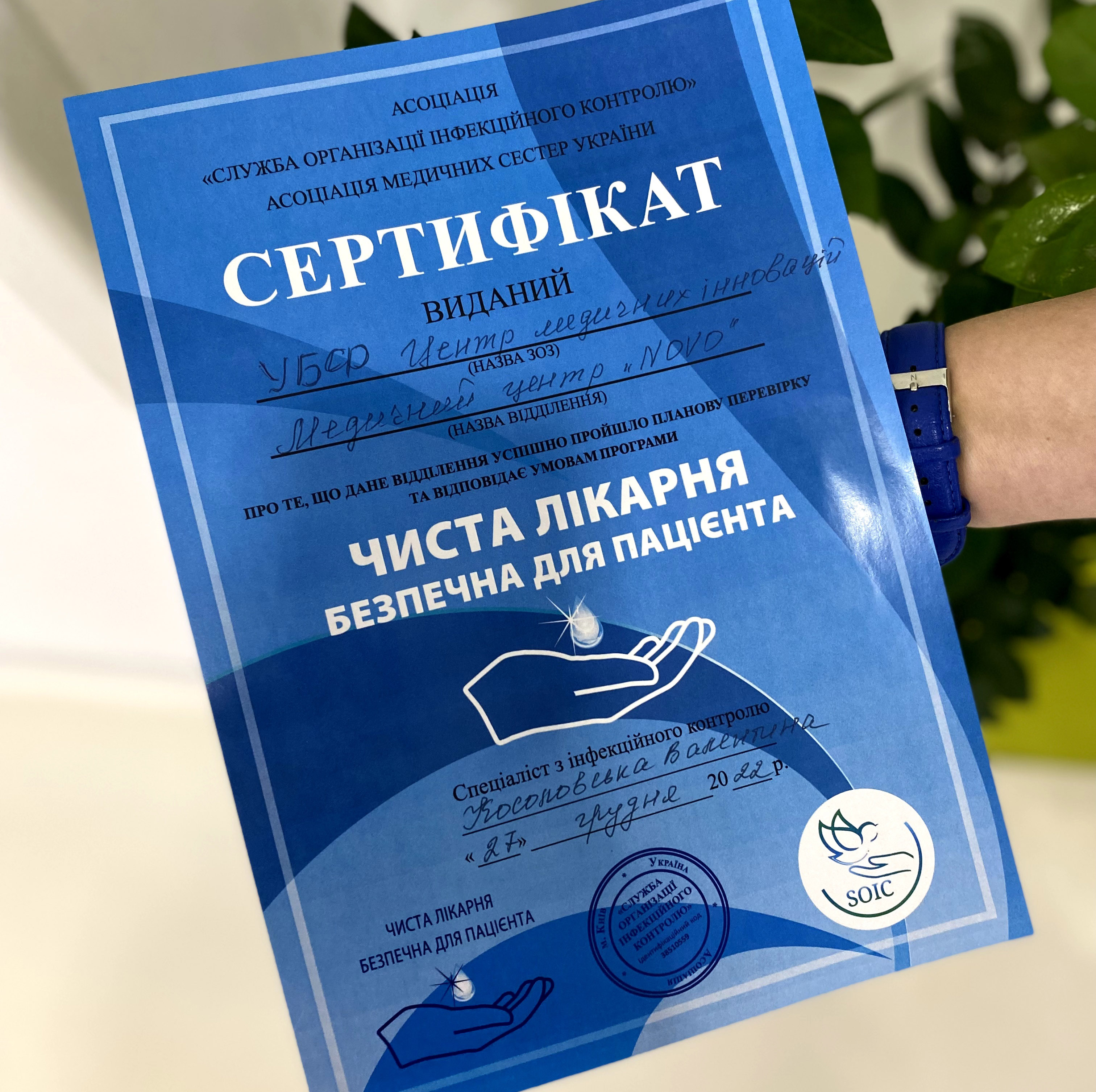 In 2019 and 2022, the "Infection Control Organization Service" and the Association of Nurses of Ukraine conducted certifications, as a result of which the NOVO Medical Center received a special distinction from the All-Ukrainian project "Clean Hospital Safe for Patients."