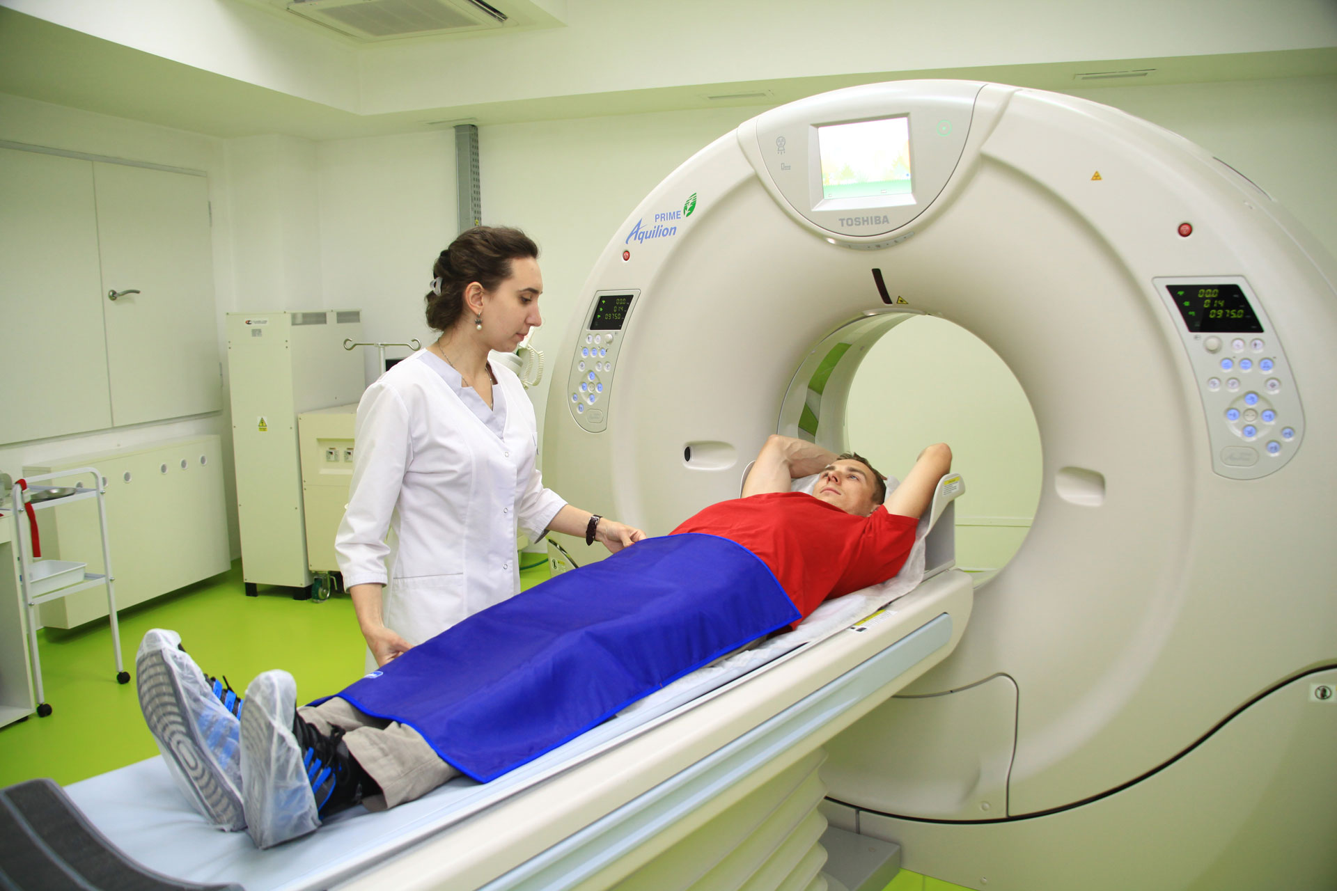The Aquilion Prime 160 computed tomography system by Toshiba collects data for up to 164 slices with a thickness of 0.5 mm in a full rotation time of as little as 0.4 seconds. This significantly reduces the risk of radiation exposure to the patient’s body while maintaining high-precision image quality. This type of diagnostics allows for simultaneous full-body screening on state-of-the-art, safe equipment.